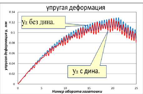 Податливость является одним из важных параметров, влияющих на стабильность показателей точности при механической обработке. Податливость ТС в случае круглого врезного шлифования напрямую зависит от величины упругих деформаций заготовки. В настоящий момент имеются работы [19, 20], направленные на установления взаимосвязи между глубиной резания, упругими деформациями ТС и силой резания для различных видов круглого шлифования, но отсутствуют работы, учитывающие влияние динамики на упругие деформации ТС.