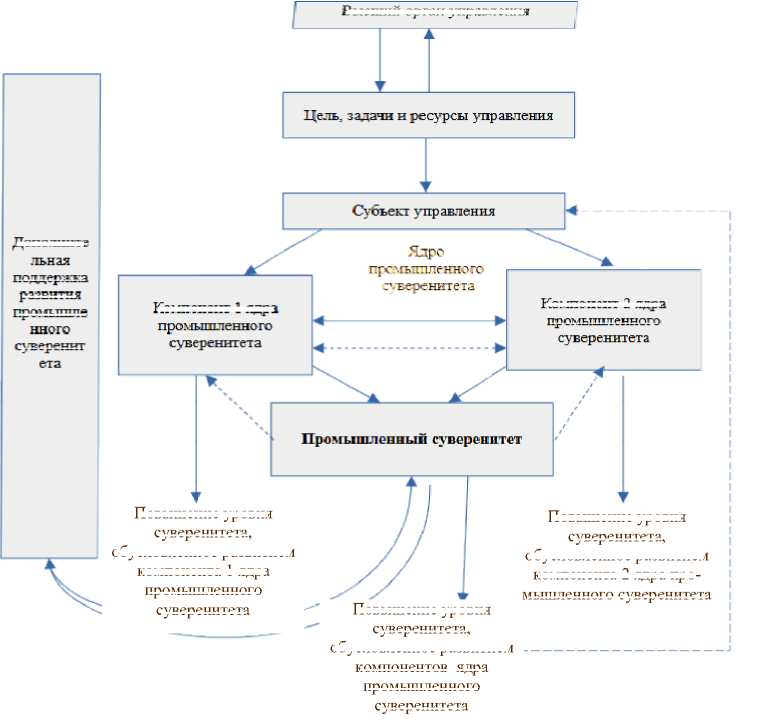 Обратные связи, обозначенные прерывистыми линиями, иллюстрируют возвратные потоки информации, которые способствуют контролю и корректировке управленческих решений. Управляющий субъект и участники блока дополнительной поддержки развития промышленного суверенитета влияют на совокупность «субъект управления» косвенно, поэтому имеют «висячие связи».