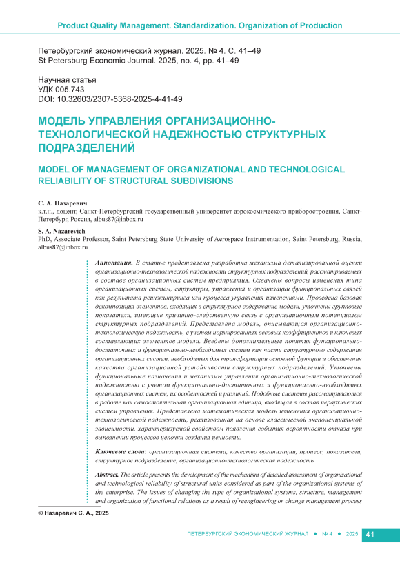 В статье представлена разработка механизма детализированной оценки организационно-технологической надежности структурных подразделений, рассматриваемых в составе организационных систем предприятия. Охвачены вопросы изменения типа организационных систем, структуры, управления и организации функциональных связей как результата реинжиниринга или процесса управления изменениями. Проведена базовая декомпозиция элементов, входящих в структурное содержание модели, уточнены групповые показатели, имеющие причинно-следственную связь с организационным потенциалом структурных подразделений. Представлена модель, описывающая организационнотехнологическую надежность, с учетом нормированных весовых коэффициентов и ключевых составляющих элементов модели. Введены дополнительные понятия функциональнодостаточных и функционально-необходимых систем как части структурного содержания организационных систем, необходимых для трансформации основной функции и обеспечения качества организационной устойчивости структурных подразделений. Уточнены функциональные назначения и механизмы управления организационно-технологической надежностью с учетом функционально-достаточных и функционально-необходимых организационных систем, их особенностей и различий. Подобные системы рассматриваются в работе как самостоятельная организационная единица, входящая в состав иерархических систем управления. Представлена математическая модель изменения организационнотехнологической надежности, реализованная на основе классической экспоненциальной зависимости, характеризуемой свойством появления события вероятности отказа при выполнении процессов цепочки создания ценности.