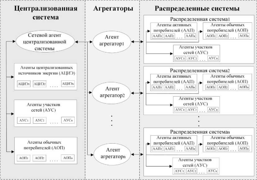 Для решения задач с помощью мультиагентного подхода разработана структура мультиагентной системы (МАС), в которой можно выделить три основных уровня взаимодействия агентов (рис. 1): централизованная система; агрегаторы; распределенные системы.