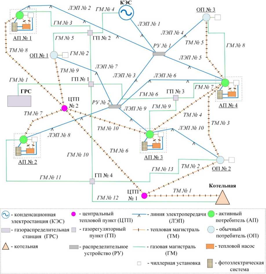 генерации, которые представлены четырьмя активными потребителями с собственными источниками энергии в виде фотоэлектрических систем, тепловых насосов и чиллерных установок и объектами централизованной генерации в виде конденсационной электростанции (КЭС), централизованной котельной и газораспределительной станции. Также в схеме присутствуют три обычных потребителя. Объекты централизованной и распределенной генерации, а также потребители соединены между собой линиями электропередачи и трубопроводами.