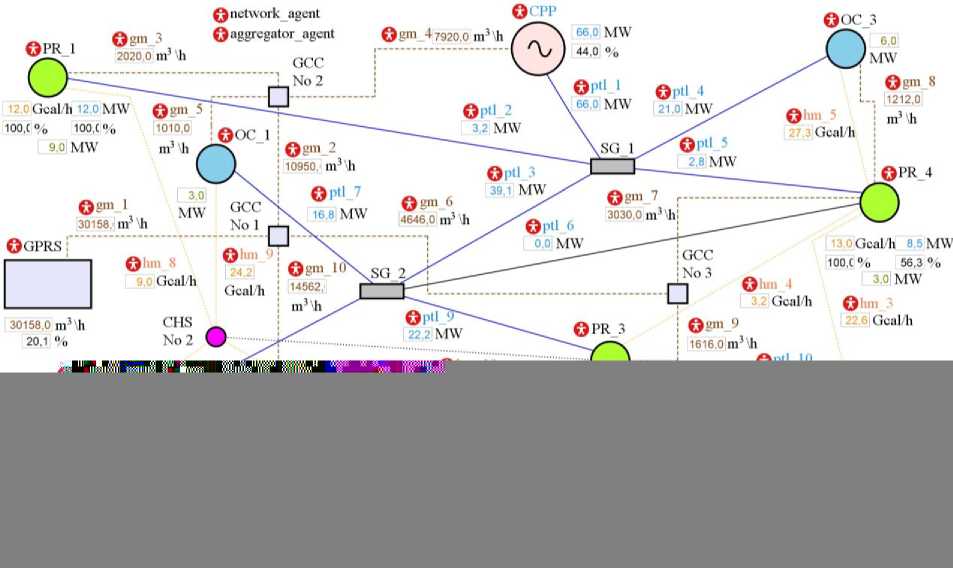 Апробация предложенных авторами принципов и механизмов осуществлялась с помощью разработанной мультиагентной модели в программной среде AnyLogic. Проводилась оценка различных схем энергоснабжения для всех возможных 12 вариантов коалиций: коалиция № 1 – кооперации нет; коалиция № 2 – полная кооперация (рис. 3); коалиции № 3–6 – частичные кооперации, включающие по три участника; коалиции № 7–12 – частичные кооперации, включающие по два участника. Поиск решения выполнялся с участием всех объектов ИЭС, представленных индивидуальными агентами согласно разработанной структуре МАС, в результате взаимодействия четырех энергетических систем (электро-, тепло-, холодо- и газоснабжения) получены решения по энергоснабжению обычных потребителей и активных потребителей.