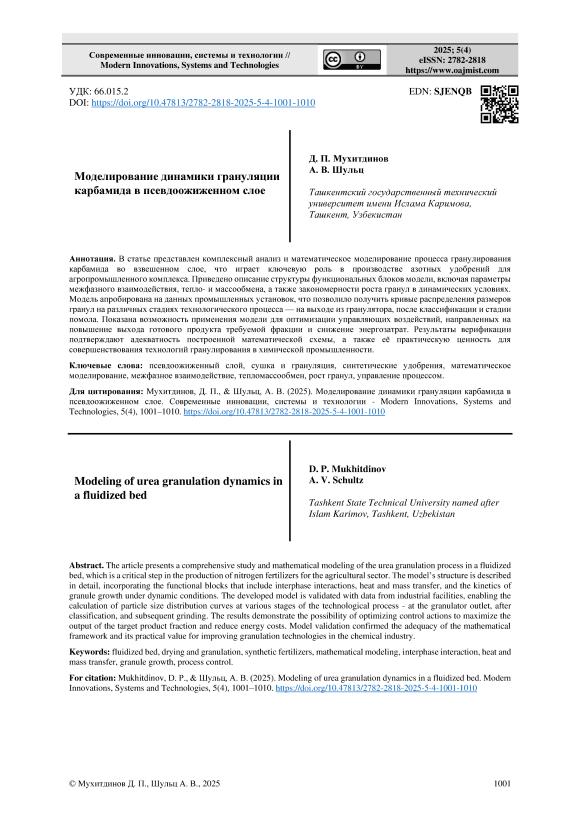 Псевдоожиженный слой, сушка и грануляция, синтетические удобрения, математическое моделирование, межфазное взаимодействие, тепломассообмен, рост гранул, управление процессом.