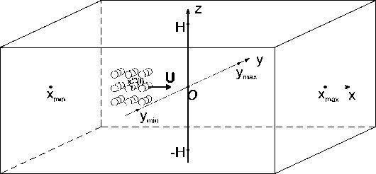 Пусть стая рыб начинает движение в момент времени t = 0 так, что каждая рыба движется в положительном направлении оси Ox со скоростью U 1 = (a1, 0, 0). Центр масс стаи в начальный момент времени находится в точке с координатами x 0m = (x 0 m , 0, 0), x 0 m < 0. В момент времени, когда центр масс достигает плоскости x = 0, скорость каждой рыбы мгновенно становится равной U 2 = (0, b 2 , 0). Таким образом, скорость изменяется со временем следующим образом: