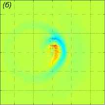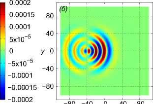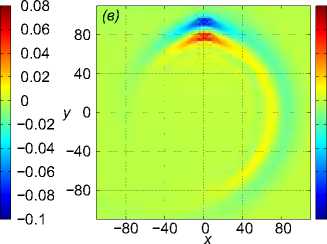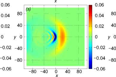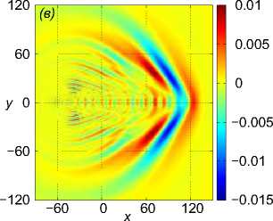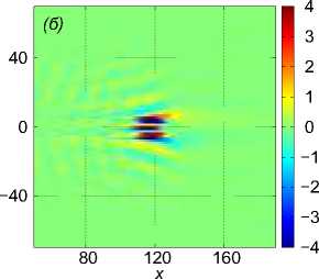 Далее показаны результаты моделирования поворота на 90° для скоростей a1 = b2 = 1 м/с. Стая состоит из M = 27 одинаковых рыб, расстояние между рыбами p = 5 м. В начальный момент времени центр масс стаи x0m = x04 находится в точке с координатами (—40 м, 0, 0). Схема движения показана на рис. 3. Результаты численного решения задачи (1) – (5), (9), (10) показаны на рис. 4. Показано горизонтальное сечение z =1 функции вертикального смещения жидкости Z(х,У, 1) в момент t = 39, 8 c непосредственно перед поворотом (рис. 4 а), в момент времени t = 63, 7 c (рис. 4 б), в момент времени t = 132, 3 c (рис. 4 в). Из рисунков видно, что сначала за движущейся стаей формируется картина присоединенных волн. После скачкообразного изменения направления скорости происходит деформация картины возмущения в горизонтальной плоскости, а затем, со временем, за продолжающей движение вдоль оси Oy стаей формируется классическая картина присоединенных волн; одновременно с этим продолжается (с меньшей интенсивностью) распространение возмущения по первоначальному направлению, а именно вдоль оси Ox.