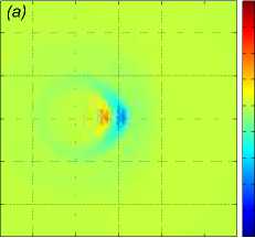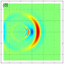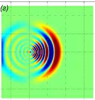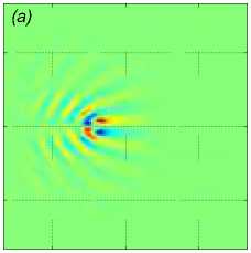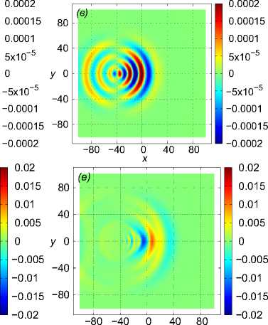 В настоящей главе численно исследуется возмущение от движущейся стаи рыб, его характерные отличия от возмущения, создаваемого отдельным точечным массовым источником. В частности, для интересов обнаружения стай промысловых рыб, представляет интерес изучение полей возмущения вблизи стаи рыб, а также возмущения, появившегося в результате резкого маневра стаи. Такие исследования требуют численного решения задачи (1) – (4), они не могут быть проведены аналитически или с использованием известных асимптотических формул [20, 21], верных в дальней зоне для устоявшихся присоединенных волн.