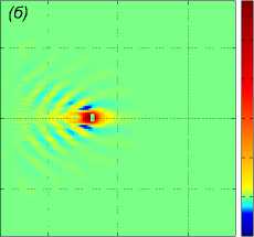 Рассмотрим пример численного моделирования горизонтального прямолинейного движения. Пусть стая из M = 27 рыб движется горизонтально в положительном направлении оси Ox со скоростью U = (1, 0, 0), см. рис. 1. Расстояние между любыми двумя ближайшими рыбами p = 5 м, то есть стая имеет размер 10 м х 10 м х 10 м. В начальный момент времени центр масс стаи x cm = M ^ ^1 x i , находится в точке с координатами ( - 40, 0, 0). Схема стаи и функция f (x, t) показаны на рис. 1 и рис. 2 а соответственно, результаты численного решения задачи (1) – (5), (9) приведены на рис. 2 б и рис. 2 в. На рис. 2 б показано нормированное вертикальное смещение жидкости Z(x,y,z,t) = N2nB 1 Z(x,y,z,t) в вертикальном сечении у = 0, проходящем через центр стаи. Видна картина обтекания рыб стаи, находящихся на уровнях глубины z = — p, z = 0, z = p. На рис. 2 в показано вертикальное смещение жидкости Z (x, у, 20) в горизонтальной плоскости, находящейся на уровне z = 20, то есть на расстоянии 15 м от стаи по вертикали. В картине возмущения на рис. 2 в видно влияние формы стаи по сравнению с картиной возмущения от одиночного точечного источника [20]. Один такой расчет, то есть моделирование движения стаи из точки ( — 40, 0, 0) до момента ее выхода на границу области Q, занимал примерно трое суток на одном вычислительном узле (два процессора Intel Xeon 3 ГГц, 192 Мб ОЗУ) суперкомпьютера МВС-10П Центра коллективного пользования вычислительными ресурсами МСЦ НИЦ Курчатовский институт. Для расчета использовалась разностная сетка размером 300 х 300 х 300 точек, было сделано 90 шагов по времени.