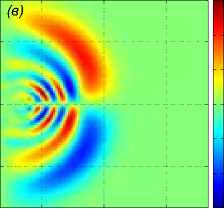 Рис. 5 . Моделирование синусоидального движения рыб в стае. Показаны нормированное вертикальное смещение Z (x, 0, z) в вертикальном сечении y = 0 м (a), горизонтальная компонента скорости v y в вертикальной плоскости z = 1 м (b) и в горизонтальной плоскости z = 10 м (c) в момент времени t = 28, 8 с после начала движения
