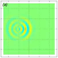 Рис. 2 . Функция f , задающая правую часть (1), в вертикальном сечении у = 0 (a), нормированное вертикальное смещение жидкости Z (x, 0,z) в вертикальном сечении у = 0 (b), горизонтальное сечение функции вертикального смещения жидкости
