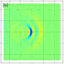 Для решения задачи (1) – (3) на языке программирования С++ была написана компьютерная программа, реализующая неявную разностную схему на равномерной расчетной сетке [15], где для решения системы линейных уравнений на каждом шаге по времени использовался обобщенный метод минимальных невязок [16]. Рассчитывались поля скорости (6), давления (7), вертикального смещения (8) жидкости. С использованием этой программы проводилось моделирование движения одиночного источника возмущения в однородной стратифицированной жидкости, при этом точечный массовый источник возмущения двигался равномерно горизонтально [17, 18] или под углом к горизонту [15, 19], корректность расчетов верифицировалась сравнением с известными асимптотическими решениями [20, 21], c результатами экспериментов [22]. Модифицированный вариант программы использовался для моделирования возмущения с условием свободной поверхности на верхней границы области Q; в этом случае решалась задача типа (1) для вертикальной компоненты скорости vz в области Q, а затем задача Коши для обыкновенного дифференциального уравнения в каждой точке вертикальной границы z = H области Q, см. [23]. Вообще говоря, реализованный метод расчета позволяет проводить моделирование для изменяющейся по высоте частоты плавучести, N = N(z), когда частота плавучести изменяется скачком [24] или непрерывно [15], однако далее в настоящей работе будем считать, что жидкость однородно стратифицированная, N = const. Исходный код расчетной программы доступен в интернете по адресу: