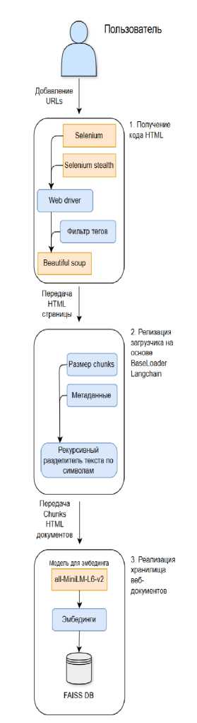 Для работы с HTML-страницами разработаны специализированные решения на базе Selenium и BeautifulSoup, обеспечивающие фильтрацию текста и формирование цепочек «вопрос–ответ» (схема представлена на рисунке 3).