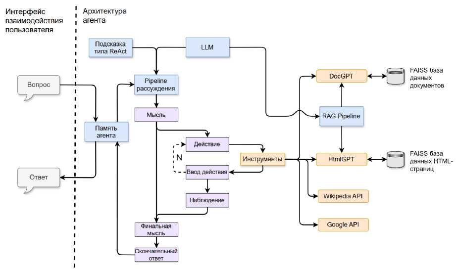 В архитектуру также включен гибридный RAG-модуль, объединяющий локальные источники (DocGPT, HtmlGPT) с онлайн-инструмен-тами (Wikipedia API, Google API), что обеспечивает баланс между скоростью локального поиска и актуальностью сетевых данных. Такая интеграция дает возможность агенту работать как в полностью офлайн-среде, так и при подключении к Интернету.