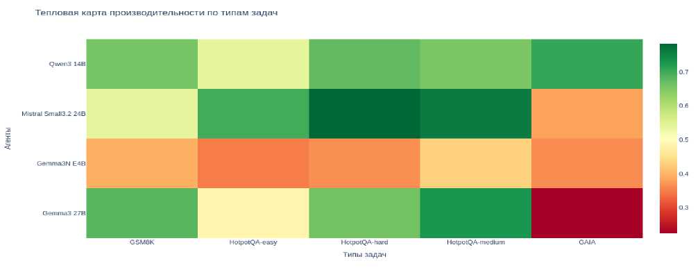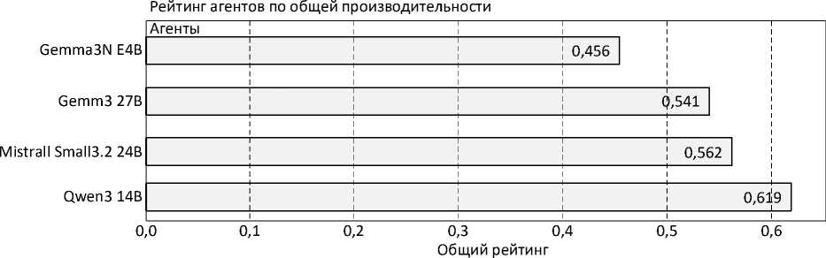 Результаты исследования показали, что Qwen3 14B является наиболее универсальной моделью, обеспечивающей высокий уровень точности и семантической согласованности при эффективном использовании инструментов. Mistral-Small 3.2 24B проявила лучшие качества в задачах с многошаговыми рассуждениями и может рассматриваться как перспективный выбор для сценариев, требующих глубокого анализа и интеграции информации. Gemma 3 27B продемонстрировала устойчивые показатели и сбалансированный профиль, что делает ее применимой в мультимодальных приложениях при наличии достаточных вычислительных ресурсов. В то же время компактная модель Gemma 3n e4b подтвердила потенциал легких решений, однако ее текущая эффективность остается ограниченной и требует дальнейшей оптимизации.