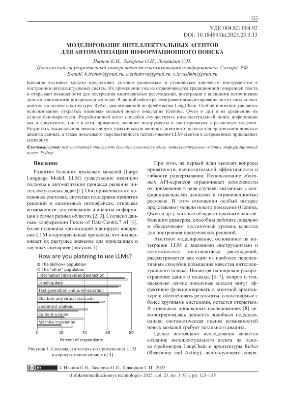 менные компактные модели для решения задач информационного поиска. Научная новизна работы заключается в демонстрации того, что легкие open-source LLM могут успешно применяться в агентном моделировании, обеспечивая баланс между качеством генерации, автономностью и возможностью локального развертывания. Практическая ценность исследования заключается в том, что такие решения открывают путь к внедрению интеллектуальных агентов в бизнес-среде и в научных приложениях, где особенно важны приватность и контроль над вычислительными ресурсами.