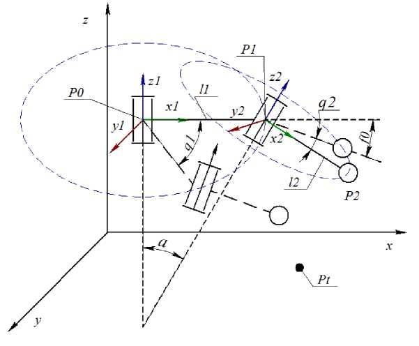 Рис. 2. Кинематическая схема двухзвенного манипулятора с наклонной осью вращения