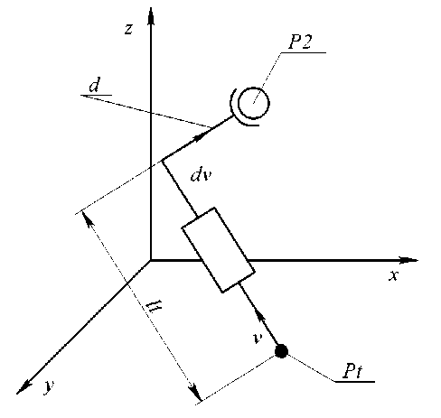 Поскольку на этапе предоперационного планирования заданы целевая точка Pt , единичный вектор требуемой ориентации инструмента v , а также расстояние d , задача сводится к однозначному определению положения точки P 2 точки крепления рабочего органа к манипулятору. Эта точка вычисляется геометрически как положение, из которого инструмент, ориентированный вдоль v и проходящий через направляющую, достигает целевой точки Pt .