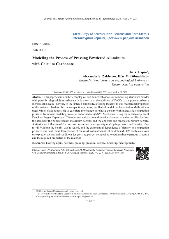 В работе рассмотрены технологические и численные аспекты прессования порошкового алюминия с порообразующим карбонатом кальция. Показано, что ввод CaCO₃ в порошковую смесь повышает общую пористость спечённого композита, влияя на плотность и механические свойства материала. Для описания процесса компактизации была использована модель Хеккеля, реализованная в Mathcad, что позволило рассчитывать изменение относительной плотности при нарастающем давлении прессования. Также проведено численное моделирование в ANSYS Mechanical с использованием плотностно-зависимой модели Drucker– Prager Cap. Полученные расчёты показали характерное распределение плотности: область у пуансона достигает максимальной плотности, а у противоположного торца – минимальной. Выявлено значительное влияние трения на неоднородность прессовки (падение давления и плотности до ≈10 % по высоте), а также подтверждена экспоненциальная зависимость плотности от давления прессования. Сопоставление результатов математических моделей и FEM‑анализов позволяет прогнозировать оптимальные условия прессования порошковых композитов для получения однородной структуры и требуемых свойств материала.