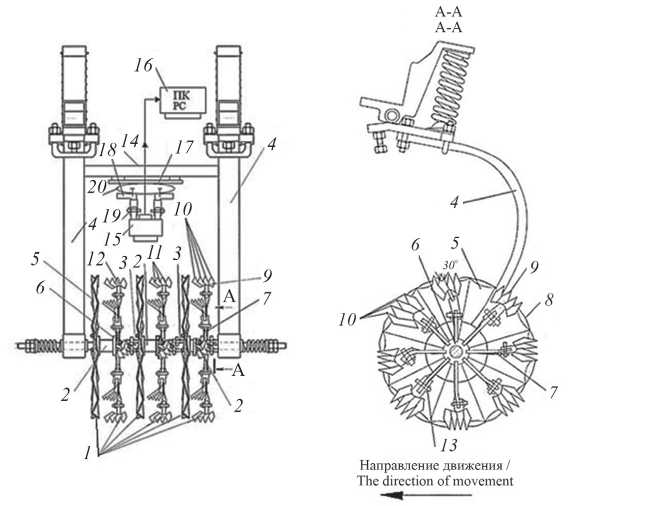 1 – диски; 2 – батарея; 3 – шарниры; 4 – стойка; 5 – рифленые диски; 6 – игольчатые диски; 7 - игла; 8 - окружность; 9 - лопатки зубчатые; 10 - вершина; 11 - впадина; 12 - скребок;
