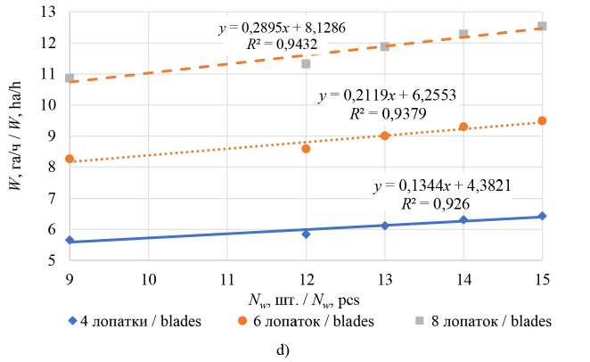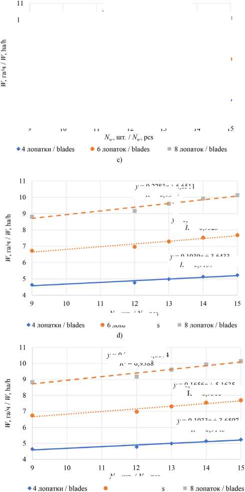 Note: β - coefficient of use of the operating width; Nw – number of waves, pcs.; τ w.d , τ n.d – time-use factor for wavy discs and needle discs, respectively, the time usage factor for changing wav . e discs and needle discs; k wd - number of wave discs, pcs.; k sb - number of blades, pcs.; 9 m - the speed of movement, кm/h.; L 1 – length of needle with blade, m; Dwd – diameter of the wave disk, m; W – performance of a turbodisc cultivator. .