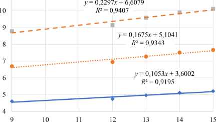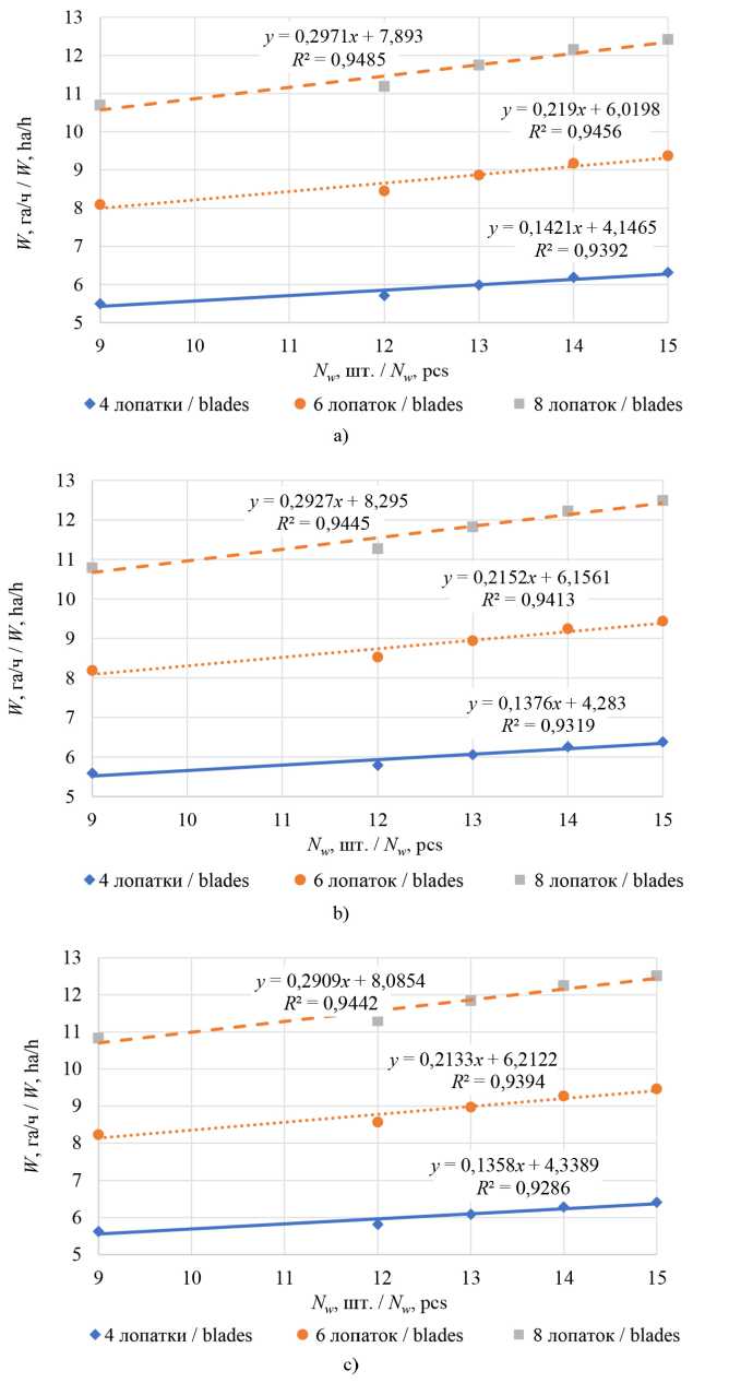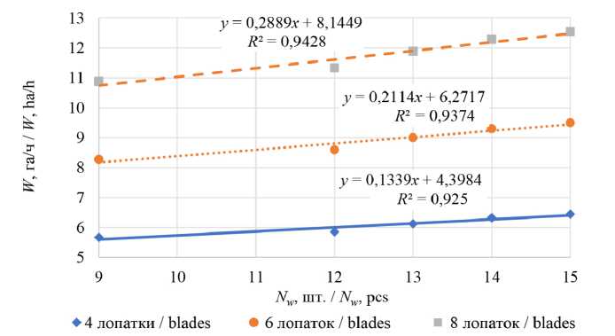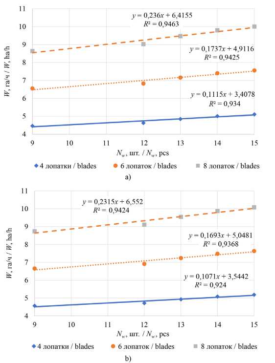 иглы с лопаткой, диаметра волнистого диска, производительность ТДК повысилась с 3,72 до 12,55 га/ч, что также возможно при увеличении количества волнистых дисков и лопаток на игольчатом диске. Сопоставив эти данные со средними значениями производительности, выведенными в других исследованиях, выявлено расхождение на 6,8 % [27]. Так, при движении агромашины со скоростью 15 км/ч и длине игл 0,257–0,320 м производительность составляет: при 4 лопатках – 3,72–5,37 га/ч; при 6 лопатках – 5,46–7,91 га/ч; при 8 лопатках – 7,20–10,46 га/ч. При дальнейшем увеличении скорости до 18 км/ч производительность увеличивается: с 4,46 до 6,45 га/ч с 4 лопатками; с 6,55 до 9,50 га/ч с 6 лопатками; с 8,64 до 12,55 га/ч с 8 лопатками.