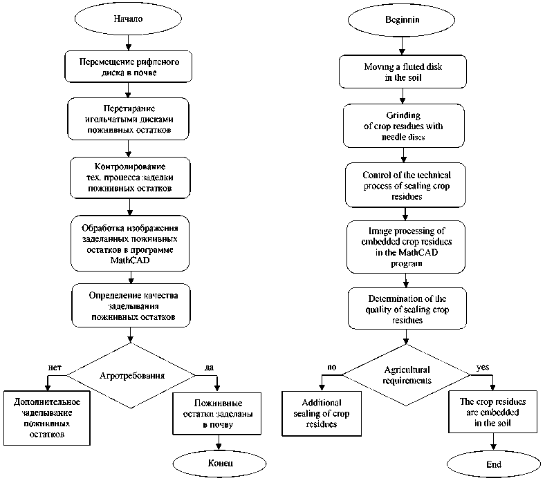 Дисковые рабочие органы (рифленые и игольчатые) выбрали по конструктивным параметрам. Рифленые диски перемещались в почве и совершали вращательные движения независимо друг от друга, а игольчатый диск перетирал пожнивные остатки. Мультимедийное устройство, на котором проводили настройку экспозиции камеры в зависимости от яркости дневного света и освещенности, производило съемку, осуществляя контроль технологического процесса заделки пожнивных остатков. Полученное изображение подавали на обработку в программе Mathcad для определения качества заделки РО по агротехническим требованиям. При несоответствии требованиям проводили контроль технологического процесса работы игольчатых дисков (рис. 2).