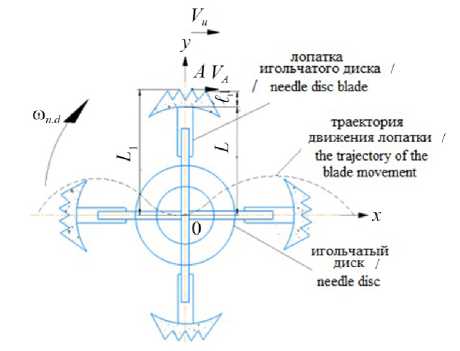 Note: a nd - angular velocity of the needle disk, s-1; V u - the speed of movement of the unit, m/s; VA – velocity of point A , m/s; ℓ 1 – length of the blade, m; L – length of the needle, m; L 1 – length of the needle with the blade, m; А - point on the blade; x, у - coordinate axes.