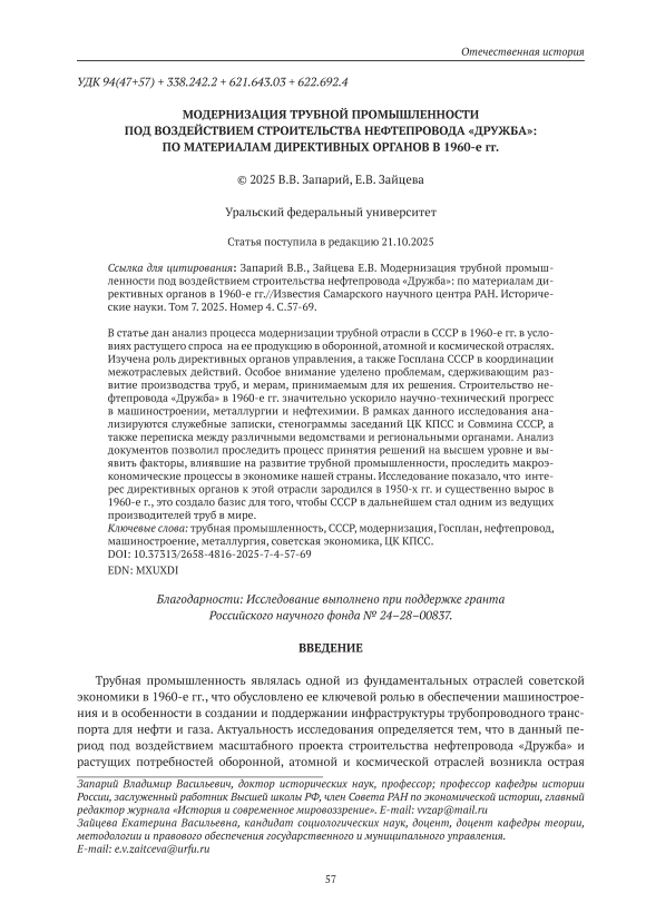 Трубная промышленность являлась одной из фундаментальных отраслей советской экономики в 1960-е гг., что обусловлено ее ключевой ролью в обеспечении машиностроения и в особенности в создании и поддержании инфраструктуры трубопроводного транспорта для нефти и газа. Актуальность исследования определяется тем, что в данный период под воздействием масштабного проекта строительства нефтепровода «Дружба» и растущих потребностей оборонной, атомной и космической отраслей возникла острая