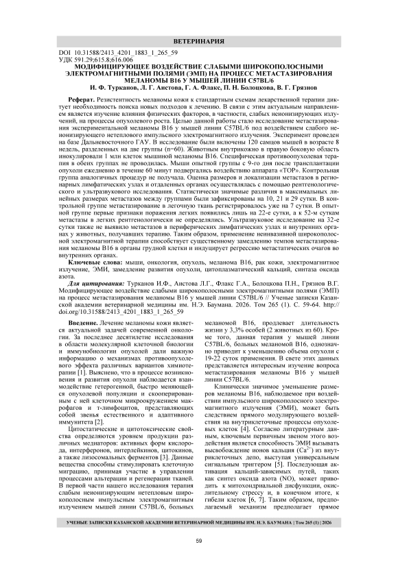 Модифицирующее воздействие слабыми широкополосными электромагнитными полями (ЭМП) на процесс метастазирования меланомы В16 у мышей линии C57BL/6