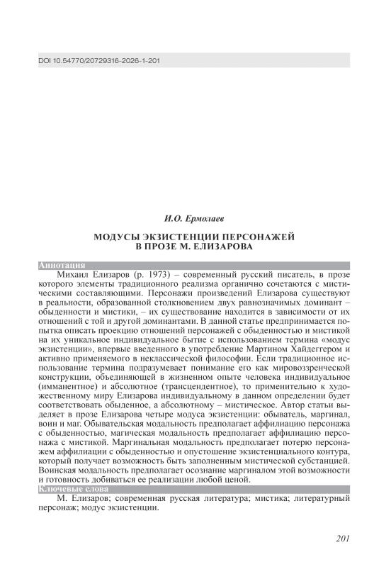 Mikhail Elizarov (b. 1973) is a modern Russian writer, in whose prose elements of traditional realism are organically combined with mystical components. The characters of Elizarov’s works exist in a reality formed by the collision of two equivalent dominants – the ordinary and the mystical – their existence depends on their relationship with both dominants. This article attempts to describe the projection of the characters’ relationship with the ordinary and mystical to their unique individual existence using the term “mode of existence”, first coined by Martin Heidegger and actively used in non-classical philosophy. If the traditional use of the term implies understanding it as a philosophical construct that unites the individual (immanent) and the absolute (transcendent) in a person’s life experience, then in relation to Elizarov’s artistic world, the individual in this definition will correspond to the ordinary, and the absolute to the mystical. The author of the article identifies four modes of existence in Elizarov’s prose: the philistine, the marginal, the warrior and the magician. The philistine modality presupposes the character’s affiliation with the ordinary, the magical modality presupposes the character’s affiliation with mysticism. Marginal modality presupposes the character’s loss of affiliation with the ordinary and the emptying of his existential contour, which gets the opportunity to be filled with mystical substance. The warrior modality presupposes the marginal’s awareness of this opportunity and willingness to achieve its realization at any cost.