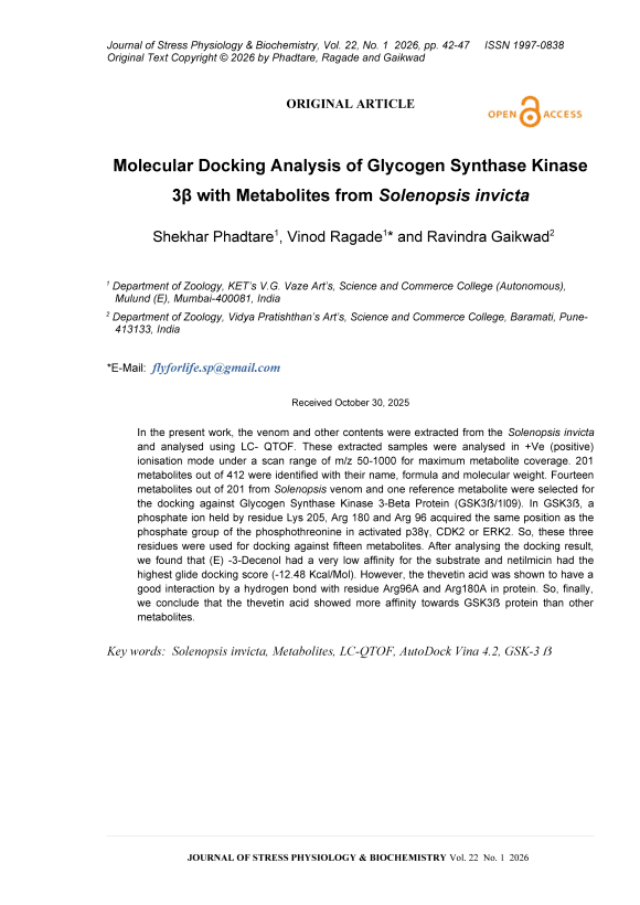 In the present work, the venom and other contents were extracted from the Solenopsis invicta and analysed using LC- QTOF. These extracted samples were analysed in +Ve (positive) ionisation mode under a scan range of m/z 50-1000 for maximum metabolite coverage. 201 metabolites out of 412 were identified with their name, formula and molecular weight. Fourteen metabolites out of 201 from Solenopsis venom and one reference metabolite were selected for the docking against Glycogen Synthase Kinase 3-Beta Protein (GSK3ẞ/1l09). In GSK3ẞ, a phosphate ion held by residue Lys 205, Arg 180 and Arg 96 acquired the same position as the phosphate group of the phosphothreonine in activated p38γ, CDK2 or ERK2. So, these three residues were used for docking against fifteen metabolites. After analysing the docking result, we found that (E) -3-Decenol had a very low affinity for the substrate and netilmicin had the highest glide docking score (-12.48 Kcal/Mol). However, the thevetin acid was shown to have a good interaction by a hydrogen bond with residue Arg96A and Arg180A in protein. So, finally, we conclude that the thevetin acid showed more affinity towards GSK3ẞ protein than other metabolites.