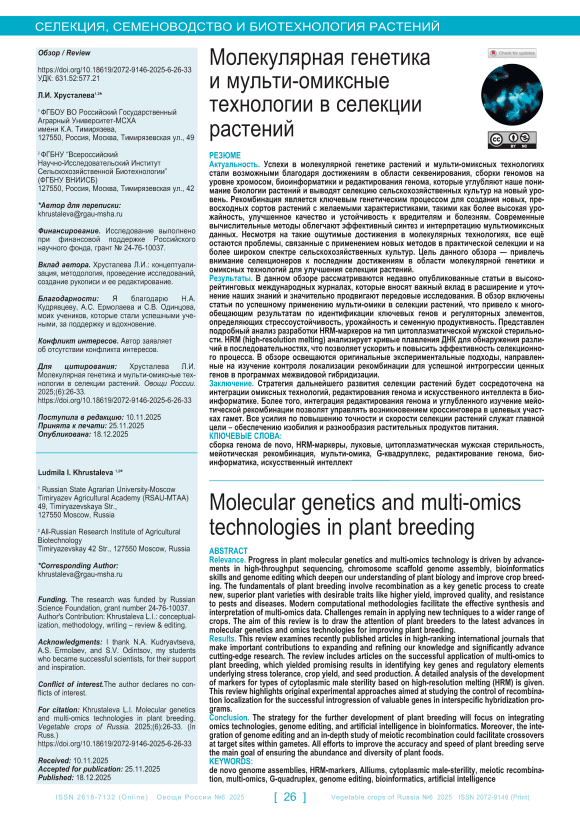 Актуальность. Успехи в молекулярной генетике растений и мульти-омиксных технологиях стали возможными благодаря достижениям в области секвенирования, сборки геномов на уровне хромосом, биоинформатики и редактирования генома, которые углубляют наше понимание биологии растений и выводят селекцию сельскохозяйственных культур на новый уровень. Рекомбинация является ключевым генетическим процессом для создания новых, превосходных сортов растений с желаемыми характеристиками, такими как более высокая урожайность, улучшенное качество и устойчивость к вредителям и болезням. Современные вычислительные методы облегчают эффективный синтез и интерпретацию мультиомиксных данных. Несмотря на такие ощутимые достижения в молекулярных технологиях, все ещё остаются проблемы, связанные с применением новых методов в практической селекции и на более широком спектре сельскохозяйственных культур. Цель данного обзора — привлечь внимание селекционеров к последним достижениям в области молекулярной генетики и омиксных технологий для улучшения селекции растений. Результаты. В данном обзоре рассматриваются недавно опубликованные статьи в высокорейтинговых международных журналах, которые вносят важный вклад в расширение и уточнение наших знаний и значительно продвигают передовые исследования. В обзор включены статьи по успешному применению мульти-омики в селекции растений, что привело к многообещающим результатам по идентификации ключевых генов и регуляторных элементов, определяющих стрессоустойчивость, урожайность и семенную продуктивность. Представлен подробный анализ разработки HRM-маркеров на тип цитоплазматической мужской стерильности. HRM (high-resolution melting) анализирует кривые плавления ДНК для обнаружения различий в последовательностях, что позволяет ускорить и повысить эффективность селекционного процесса. В обзоре освещаются оригинальные экспериментальные подходы, направленные на изучение контроля локализации рекомбинации для успешной интрогрессии ценных генов в программах межвидовой гибридизации. Заключение. Стратегия дальнейшего развития селекции растений будет сосредоточена на интеграции омиксных технологий, редактирования генома и искусственного интеллекта в биоинформатике. Более того, интеграция редактирования генома и углубленного изучение мейотической рекомбинации позволят управлять возникновением кроссинговера в целевых участках гамет. Все усилия по повышению точности и скорости селекции растений служат главной цели – обеспечению изобилия и разнообразия растительных продуктов питания.