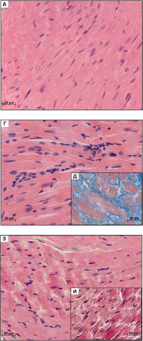 Рис. 1. Морфологическая характеристика миокарда самцов мышей BALB/c контрольной и экспериментальной групп. А. Контрольная группа: кардиомиоциты с поперечной исчерчен-ностью. Б. 14-е сутки: лимфоцитарная и гистиоцитарная инфильтрация, контрактурные повреждения. В. 14-е сутки: субэпикардиальная лимфоцитарная инфильтрация, ИГХ окрашивание с антителами к CD3. Г. 28-е сутки: диффузная лимфоцитарная и ги-стиоцитарная инфильтрация. Д. 28-е сутки: очаговый фиброз, окраска по Маллори. Е. 42-е сутки: диффузная лимфоцитарная и гистиоцитарная инфильтрация, вакуолизация цитоплазмы кардиомиоцитов. Ж. 42-е сутки: очаговый фиброз, окраска по Маллори. З. 60-е сутки: диффузная лимфо-гистиоцитарная инфильтрация, кардиомиоцитолиз, интерстициальный отек, исчезновение поперечной исчерченности. И. 60-е сутки: кардиомиоцитолиз, некроз кардиомиоцитов, окраска по Ли (ГОПФ), ув. ×640
