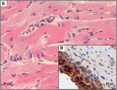На 14-е сутки развития миокардита на гистологических препаратах миокарда отмечалась очаговая субэпикардиальная лимфоидно-гистиоцитарная инфильтрация, выраженный периваскулярный отёк и мышечные контрактуры (рис. 1Б). Изменения наблюдались как в предсердии, так и в желудочке, при этом в предсердиях они были более выраженными. При ИГХ исследовании в препаратах отмечалась субэпикардиальная инфильтрация CD3+ Т-лимфоцитами (рис. 1В).
