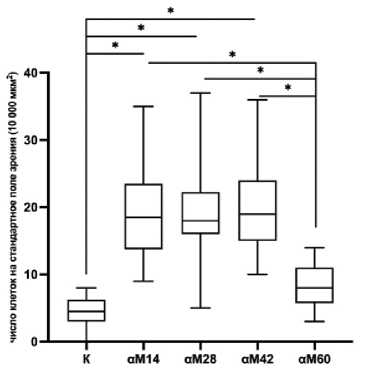 Рис. 2. Количество лимфо-гистиоцитарных клеток в миокарде самцов мышей BALB/c контрольной группы (К), на 14-е (αМ14), 28-е (αМ28), 42-е (αМ42) и 60-е (αМ60) сутки развития аутоиммунного миокардита в стандартном поле зрения (10 000 мкм2)