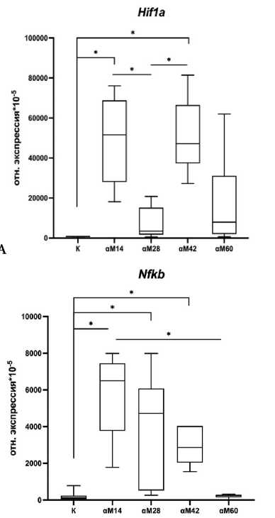 Рис. 3. Экспрессия мРНК А) фактора, индуцируемого гипоксией, Hif1a , Б) противоспалительного цитокина Tgfb , В) транскрипционного фактора Nfkb , Г) провоспалительного цитокина Il1b , Д) провоспалительного цитокина Il6 и Е) противовоспалительного цитокина Il10 в миокарде самцов контрольных и опытных групп, на 14-е, 28-е, 42-е и 60-е сутки аутоиммунного миокардита. К –контрольная группа (n=20); αМ14 – группа мышей, подвергшиеся введению α-миозина и выведенные на 14-е сутки после второй иммунизации (n=10); αМ28 – группа мышей, подвергшиеся введению α-миозина и выведенные на 28-е сутки после второй иммунизации (n=10); αМ42 – группа мышей, подвергшиеся введению α-миозина и выведенные на 42-е сутки после второй иммунизации (n=10); αМ60 – группа мышей, подвергшиеся введению α-миозина и выведенные на 60-е сутки после второй иммунизации (n=10). Для множественных сравнений использовался критерий Краскела-Уоллиса. Данные приведены в виде Ме (LQ 25%; UQ 75%)