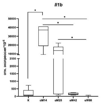 Таблица 3. Экспрессия мРНК Hif1α, Nfkb, Il1b, Il6, Il10 и Tgfb в миокарде контрольных групп (К) на 14-е (К14), 28-е (К28), 42-е (К42) и 60-е (К60) сутки у самцов мышей BALB/c. Данные приведены в виде Ме (LQ 25%- UQ 75%)