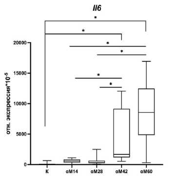 На 60-е сутки миокардита, у мышей опытной группы сохранялось повышенное уровни экспрессии Il6. Сохранение высокой экспрессии Il6 может быть связано с развитием хронического воспаления, а также быть следствием миоцитолиза. По данным литературы длительное повышение IL-6 угнетает базовую сократимость кардиомиоцитов, что приводит к снижению фракции выброса сердца [20]. По-видимому, на 60-е сутки аутоиммунного миокардита возможно появление признаков ДКМП, однако, это требует дальнейшего изучения.