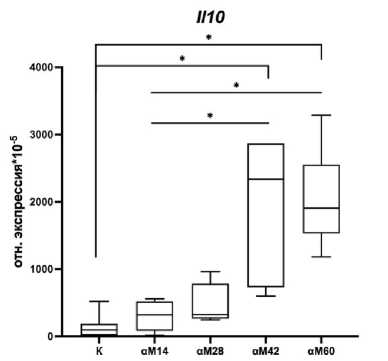 По сравнению с 42-ми сутками аутоиммунного миокардита, на 60-е сутки уровень экспрессии Il6 и Il10 не изменялся и был устойчиво высоким, чем в контрольной и других опытных группах (рис. 3 Д, Е).
