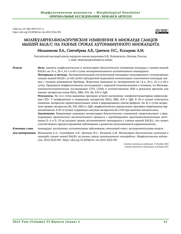 Mel’nikova EA, Sentyabreva AV, Tsvetkov IS, Kosyreva AM. Molecular and biological changes in the myocardium of male BALB/c mice at different stages of autoimmune myocarditis. Morfologicheskie Vedomosti – Morphological newsletter. 2025; 33(4):981. (4).981