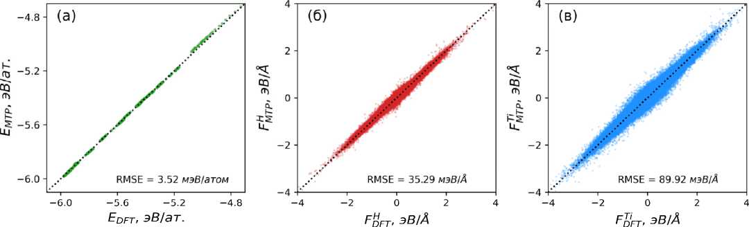 Рис. 1. Сравнение построенного MTP с обучающими данными DFT-расчетов для энергий (а), компонент сил, действующих на атомы водорода (б) и титана (в).