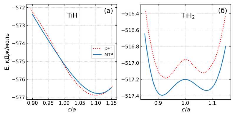лены зависимости потенциальной энергии для различных значений c/a . Решетка моногидрида оказывается стабильной при c>a , с осевым соотношением c/a = 1,10. В то же время для TiH 2 характерен сложный профиль энергии с минимумами в двух точках: c/a = 0,92 и 1,07. Построенный MTP хорошо воспроизводит энергию моногидрида, в то время как для дигидрида энергия оказывается слегка сдвинута относительно DFT-результатов на 0,2 кДж/моль (~2 мэВ/атом), хотя общий вид профиля энергии вдоль деформации c/a предсказывается верно.