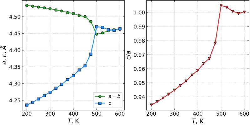 Рис. 3. МД расчеты с помощью MTP параметров решетки и тетрагонального соотношения c/a дигидрида титана для различных температур