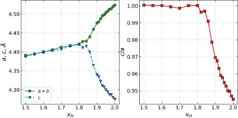 Рис. 4. Параметры решетки и осевое отношение c/a при T =300 K для гидридов с нестехиометрическим составом TiH х .