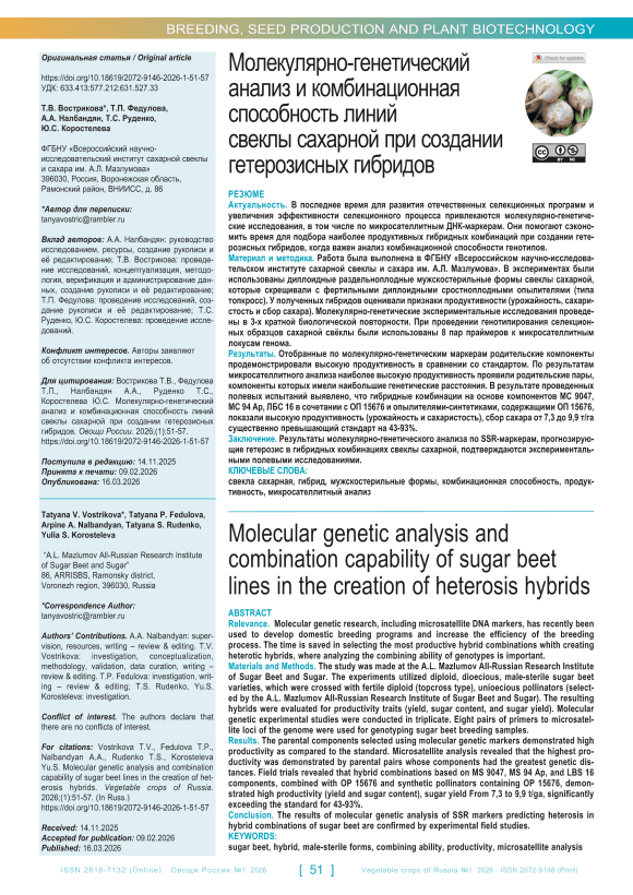 Relevance. Molecular genetic research, including microsatellite DNA markers, has recently been used to develop domestic breeding programs and increase the efficiency of the breeding process. The time is saved in selecting the most productive hybrid combinations whith creating heterotic hybrids, where analyzing the combining ability of genotypes is important. Materials and Methods. The study was made at the A.L. Mazlumov All-Russian Research Institute of Sugar Beet and Sugar. The experiments utilized diploid, dioecious, male-sterile sugar beet varieties, which were crossed with fertile diploid (topcross type), unioecious pollinators (selected by the A.L. Mazlumov All-Russian Research Institute of Sugar Beet and Sugar). The resulting hybrids were evaluated for productivity traits (yield, sugar content, and sugar yield). Molecular genetic experimental studies were conducted in triplicate. Eight pairs of primers to microsatellite loci of the genome were used for genotyping sugar beet breeding samples. Results. The parental components selected using molecular genetic markers demonstrated high productivity as compared to the standard. Microsatellite analysis revealed that the highest productivity was demonstrated by parental pairs whose components had the greatest genetic distances. Field trials revealed that hybrid combinations based on MS 9047, MS 94 Ap, and LBS 16 components, combined with OP 15676 and synthetic pollinators containing OP 15676, demonstrated high productivity (yield and sugar content), sugar yield From 7,3 to 9,9 t/ga, significantly exceeding the standard for 43-93%. Conclusion. The results of molecular genetic analysis of SSR markers predicting heterosis in hybrid combinations of sugar beet are confirmed by experimental field studies.