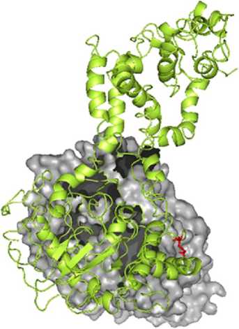 265 SPYRPAGT VrST-EKRLVAW60AlLQF'4.FYKQASDEQ€WSLlPFRSIMJrt SPYRP GT »F T «LV V N DA-LQ-LFY* Q S E E »*♦ RS» OH Y» E 272 SPYRPFGT JFCTGNRKLVWEFWAVLQLLFYSSQLSSEAEAAVVVPRSLMDHLLYKNE 331 323 LVQSHGHKLFWLOG..........ENSIESSLNDLGVSTRGRQYVQMLEEEKKRVENQ 372 • S» И» HL» • S* S»LHDLG»$TR R -AA • • ♦ 332 HQDSLEHQOVLHLNNLTOIPlSSWVOPSHNSALHDLGLSTRARLCLRAA—GErtKQKK 388 Query 373 KKHQVIQQERFLKKUMH)eYICFKQAI К - Q .R - EY* КС К GYYD*FK* N —OF AW*R ELAS** Sbjct 389 M.iEKIEQ^RSIRDALSUQEYQTKCDIRKVGVYDAFKIQ^WFI^^^ 448 Query 433 DEVLGLLKKCQLPOEFEGOIDWIKLATRYRR VEPLDIANYHRHLXHEDTGPYNKRGRPT 492 DE- +LK+ -IPO FEG DWI-L T—RR VEPLDIAKY»WLXHEDTGPY» R R? Sbjct 449 DEHEHLKRYELPKFEGRRDWIELGTQFRR VEPLDIAHYVWOIIEDTGPYURARW 533 Query 493 RYIYiQRGYEFHILKPNGHIAEOVFWNKVNGLNLGlQLEEIQETLKIISGSECGSCFKAEV 552 RY ♦ QR EH ♦ ^ •(. SCFKAEV Query 553 EELKGkPYEEVEVRVKTlEGMLREwITAGEvDEKEIFLEGSTFRKhwITLPkhhxSHS 610 EEL» КР» «V» RV LE Hi » ♦ » »IF ST» UM UP Ж $ Sbjct 538 EELRHKPFAQVQDRVLNLETAAHGWlQSSLLGD-DlFFPESTYTKhWTLPPQHKQAS 594 Query Sbjct 179 LVPR..................................SSHEQFwPFGTYLFCSDKGGVC »VPR F P G»ylFC—KG VC 189 IVPRLFFAPSCCFQFISYEHKTQLFMWLDSLGWSRGECKSSFCPSGSYLFCTIIKGAVC Query 235 LDHRGSV-RLHFHLNnATQNTEEHQRYGHYVFTLSHHFlKSRSFLGGSIPOHSYQAG ♦ON V L F -LN** * * E*H Y ♦* * F—RSF GSIP -SY-AG Sbjct 249 VDHGMWIKLLYFTLLNSSQSSSLEDHLDYADFIQKVQWQFIENR5FTEGSIPKSSYKAG Query 263 VALAVEALGFSICDT5GVLWECIETATRTVRAPILR5AELAJIELA5VLPARLEIQHYX0 * LA»E4G +♦ * • KE — A — R L SA LA L* - P R *I»K*K Sbjct 339 ITlALESlGIASHEVHFEOAKEALKKAXKLGRTRNLNSANLAIGLSKIHPFRAQIEhTKA Query 323 RCDASEEQLGYYDFFK-RySLKRDFI VWSRIRLAKFWOTVI HVETNELPFDFHIGKKW CO S EQ*GYYD FK R » KR Fl V№3»RI+LA»FWO*»I »E NELP+DFH KW Sbjct 369 SCD(6AEQMGYYDSFKQRGASKRGF)VTWIRIKLAQFWDSLI KLEAHELPYDFHKRAKW Query 382 iyasqfyqllaepldiahfykhrdiktgghylegwkryevidkwqkgvkvpee-cvrs • A$QFY»L» EPLDIA »Y» GHY»» R *RY— DKW К * RS Sbjct 429 VHASQFYKLWEPLDIAEYYRTG4ILVK6HYMQHGRERRYKIFDKkWKTENDTDHPTARS Query 441 RYASnQOTCFWAKLEQAKEWLDEARKESSDPQRRSLLREKrVPFESYANTLVTKKEVSL R-AS-TQD-CFW—E-A— L * R E D ** * E * F* YA L* KE+S Sbjct 489 RFASSTQOSCFWARVEEARDSLIKVRAE-GDARKFLKnLEOVTKFDQYAKRLIEIIKEISQ Query 501 DVKAKNSSYS 510 OV AKNSSY» Sbjct 548 DVLAJCnSSYT 557 EDSl PAD4 Рис. 1. Сравнительный анализ последовательностей EDS1 (слева) и PAD4 (справа) у Arabidopsis thaliana (образец из базы данных) и Solanum lycopersicum (исследуемый образец): синий — консервативные регионы, красный — нуклеофильный изгиб. Молекулярное моделирование. При изучении структурных особенностей EDS1 и PAD4 применяли гомологическое моделирование (38) в программе Modeller. В качестве шаблонов для EDS1 и PAD4 использовали соответственно 4NFU_A и 4NFU_B, полученные с помощью программы Blastp в NCBI. Для 4NFU_A идентичность с последовательностью EDS1 составляла 42 %, для 4NFU_B идентичность с PAD4 составляла 25 %. Оба шаблона вместе с последовательностями EDS1 и PAD4 были использованы для построения файла выравнивания. В результате было сгенерировано 10 структур. Для всех этих моделей рассчитывали значения DOPE (табл. 1). 1. Значения DOPE Scores (Discrete Optimized Protein Energy) для EDS1 и PAD4, полученные в программе Modeller v9.15 при оценке качества сгенерированных белковых структур при молекулярном моделировании Модель EDS1 PAD4 Model_1 -69354.40625 -48451.47266 Model_2 -69622.61719 -47244.53906 Model_3 -69799.39063 -47151.11719 Model_4 -69592.65625 -47395.59766 Model_5 -69583.67188 -47673.15625 Model_6 -69141.12500 -46360.92578 Model_7 -69791.44531 -46957.91016 Model_8 -69571.35156 -46751.72656 Model_9 -68983.39063 -46153.08203 Model_10 -69783.50000 -48528.74609 2. Результаты проверки полученных моделей EDS1 и PAD4 с помощью разных серверов Сервер Параметр EDS1 PAD4 PROCHECK Наиболее предпочтительная область, % 91,2 84,3 Дополнительно разрешенные области, % 7,1 13,4 Разрешенные области без ограничений, % 1,1 1,1 Запрещенные области, % 0,5 1,1 Общий G-фактор 0,01 0,08 Verify3D Средний балл 3D-1D > 0,2 79,73 65,4 ERRAT Общее качество 87,374 89,298 ProSA Z-score -10,65 -2,54 MolProbity Отклонения Св > 0,25 А, % 0,08 0,18 Остатки со слабыми связями, % 0,02 0,02 Остатки с «плохими» углами, % 0,17 0,15 VADAR Объединенное стандартное отклонение 0,13 0,71 Средняя энергия водородной связи 0,17 0,14 PROSESS Усредненное стандартное отклонение 13,45 12,59 Наибольшее стандартное отклонение (Chi score) 0,86 0,91 Спираль, % 46 50 Бета-цепь, % 10 10 Повороты, % 30 20 Витки, % 44 40 GeNMR Ошибка эффективного прогноза (Bump Score) 0,003 0,01 Радиус инерции 2,69 8,62 После перекрестной проверки параметров валидации были выбраны окончательные структуры, которые загрузили в базу данных моделей белков (PMDB), запи