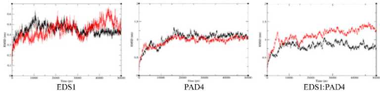 В настоящей работе предпринята попытка изучить взаимодействие EDS1 и PAD4 посредством построения их трехмерных моделей, использования гомологического моделирования для понимания молекулярных механизмов на атомном уровне, а также анализа взаимодействия белков методом докинга. После этого были изучены паттерны стабильности с помощью моделирования молекулярной динамики (МД) в течение 50 нс.