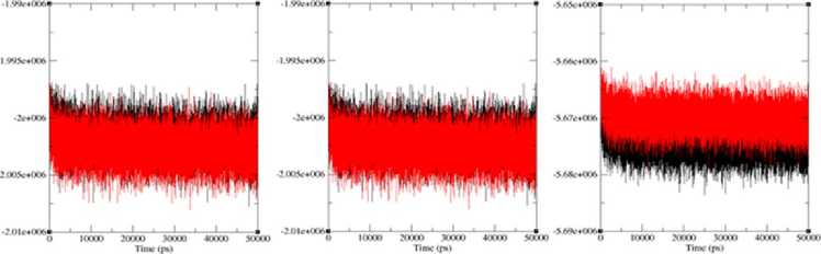 Энергию сольватированных структур минимизировали с использованием алгоритмов наискорейшего снижения и сопряженных градиентов, пока максимальная сила не становилась меньше 100 кДж моль - 1 нм - 1. Минимизированная структура подвергалась анализу динамики с ограничением положения течение 25 пс, при котором молекулы белка были зафиксированы и допускалось только движение молекул воды. Затем вся система (белок и растворитель) подвергалась динамическому моделированию без учета положения. Длины связей были ограничены их равновесными положениями с помощью алгоритма LINear Constraint Solver (LINCS) (34). Для поддержания температуры и давления во всех системах применяли баростат Берендсена с константами связывания соответственно 1,0 и 0,1 пс. Для расчета электростатических взаимодействий использовали метод Эвальда с сеткой зарядов с расстоянием отсечки 0,9 нм (35). Для финального анализа при длительности 50 нс при 300 К и давлении 1 атм использовали системы согласно описанию (36).
