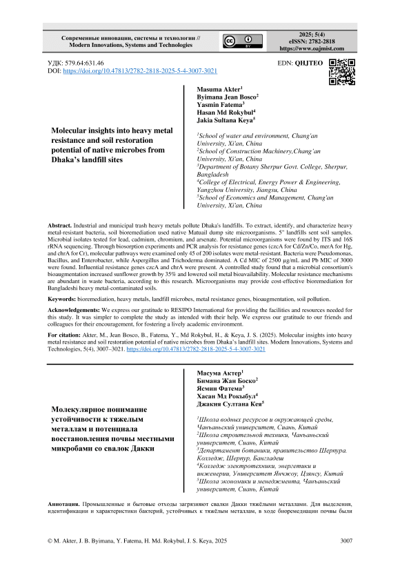 Промышленные и бытовые отходы загрязняют свалки Дакки тяжёлыми металлами. Для выделения, идентификации и характеристики бактерий, устойчивых к тяжёлым металлам, в ходе биоремедиации почвы были использованы местные микроорганизмы свалки Матуаил. 5-дюймовые свалки отправили образцы почвы. Микробные изоляты были протестированы на свинец, кадмий, хром и арсенат. Потенциальные микроорганизмы были обнаружены с помощью секвенирования ITS и 16S рРНК. С помощью экспериментов по биосорбции и ПЦР-анализа на гены устойчивости (czcA для Cd/Zn/Co, merA для Hg и chrA для Cr) были изучены молекулярные пути, и только 45 из 200 изолятов оказались устойчивыми к металлам. Бактерии были представлены Pseudomonas, Bacillus и Enterobacter, в то время как Aspergillus и Trichoderma доминировали. Были обнаружены минимальная ингибирующая концентрация кадмия (МИК) 2500 мкг/мл и минимальная ингибирующая концентрация свинца (МИК) 3000 мкг/мл. Присутствовали влиятельные гены устойчивости czcA и chrA. Контролируемое исследование показало, что биоаугментация микробного консорциума увеличила рост подсолнечника на 35% и снизила биодоступность металлов в почве. Механизмы молекулярной устойчивости. Согласно этому исследованию, в отходах много бактерий. Микроорганизмы могут обеспечить экономически эффективную биоремедиацию почв Бангладеш, загрязнённых тяжёлыми металлами.