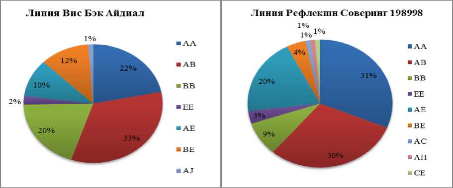 По полиморфизму капа-казеина (CSN3) выявили 10 генотипов в разрезе генеалогических линий: наибольшее количество животных в генах капа-казеина (CSN3) оказались гетерозиготные по аллели типа AВ 33% в первой группе (линия Вис Бэк Айдиал) и 30 % во второй группе (линия Рефлекшн Соверинг). Количество коров с гомозиготным генотипом AA составило 22% и 31%, соответственно. Наименьшие показатели распространения генотипа BB выявлены во второй группе, что в 3,3 раза меньше, чем животных с генотипом AB.