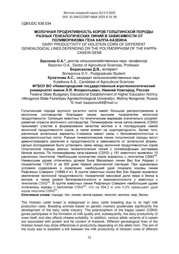 Голштинская порода крупного рогатого скота имеет большое распространение в молочном скотоводстве благодаря своим высоким показателям молочной продуктивности. Селекция животных по генетическим маркерам значительно ускоряет развитие отрасли молочного скотоводства. Полиморфизм генов каппа-казеина (CSN3) принимает участие в формировании качества молока и в последующем самой молочной продуктивности коров, а также влияет на сыропригодность. Кроме того, различные аллельные варианты k-казеина имеют связь с белковомолочностью и жирномолочностью скота. Разные генеалогические линии голштинской породы могут демонстрировать различия в продуктивности в зависимости от аллельной формы. Целью исследования было установить связь между молочной продуктивностью коров голштинской породы разных генеалогических линий с полиморфными системами белков молока. По полиморфизму капа-казеина (CSN3) у 181 животного выявлено 10 различных генотипов. Наибольшее количество коров оказалось с генотипом CSN3AB. Наивысшим удоем отличились дочери быка Маскалеро линии Вис Бэк Айдиал с показателем 11975 кг за 305 дней первой законченной лактации. При одинаковых условиях содержания и кормления, наибольший удой показали коровы линии Рефлекшн Соверинг (10899,4 кг). В группе животных линии Вис Бэк Айдиал выявлено увеличение молочной продуктивности, показателей массовой доли жира и белка в молоке, а также уровня белковомолочности и жирномолочности у животных с генотипом CSN3BE. В группе животных линии Рефлекшн Соверинг наибольшим удоем отличились коровы с генотипом CSN3AB, что на 594,2 кг или 5,2% превышает удой коров генотипа CSN3BE.